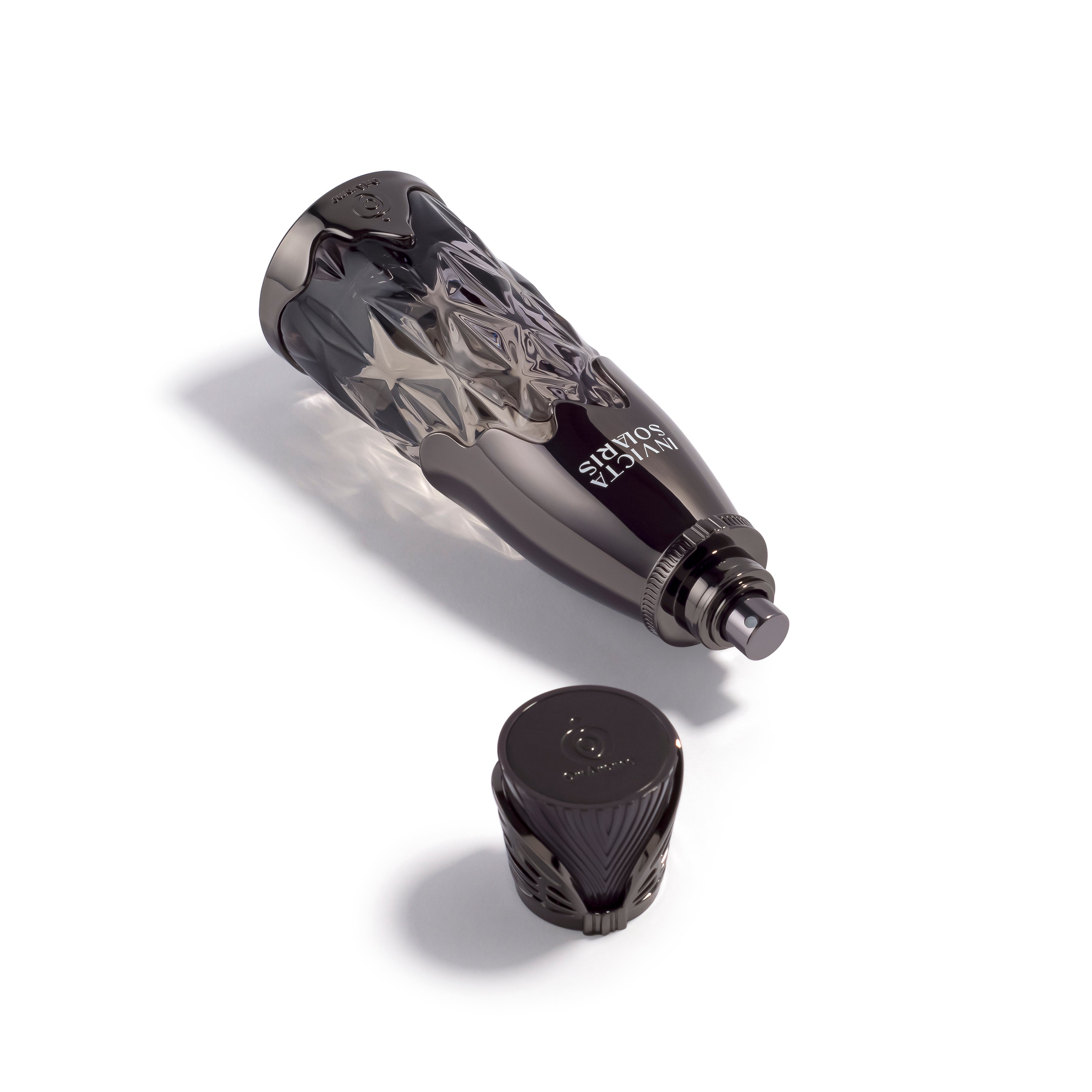 INVICTA SOLARIS is a radiant, modern fragrance opening with lemon, orange, mint, and blackcurrant. A bold floral–spice heart of rose, carrot seed, and coriander settles into a sensual base of ambrette seed and musk. Fresh, confident, unforgettable.